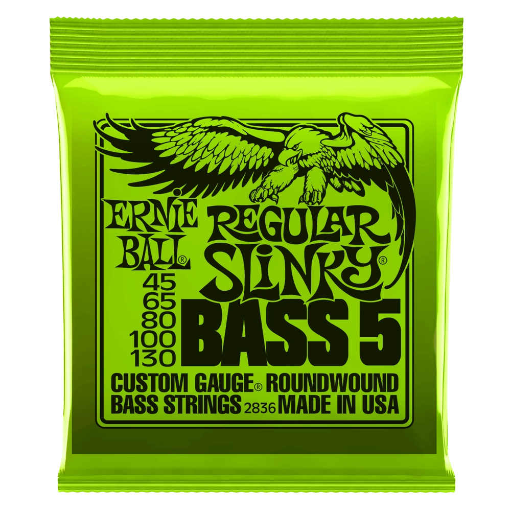 Ernie Ball Regular Slinky 5 String Bass sets are wound for a bright, balanced tone. Each bass string is manufactured with the finest and freshest raw materials in the beautiful Coachella Valley of Southern California. The list of endorsers for Ernie Ball Slinky bass strings reads like a who’s who of top selling artists. Gauges .045, .065, .080, .100 .130