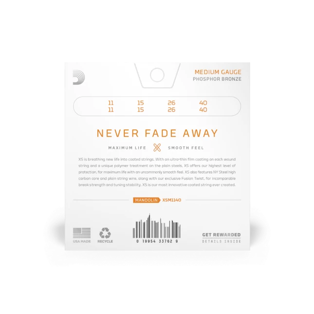 D’Addario XS Mandolin Phosphor Bronze combines our most popular acoustic alloy with our most advanced string coating technology, resulting in clear tone,Β smooth feel, and superior tuning stability β all with the longest possible string life. Available in Phosphor Bronze for Mandolin in medium gauge.