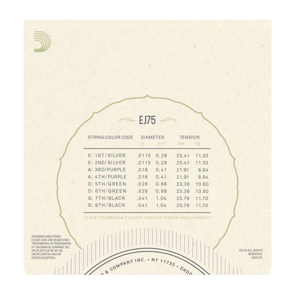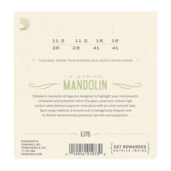 EJ75, D’Addario’s heaviest gauge mandolin set, was designed in cooperation with Ronnie McCoury, who’s hard driving, percussive style requires increased tension for maximum volume. Loopend construction for universal fit.