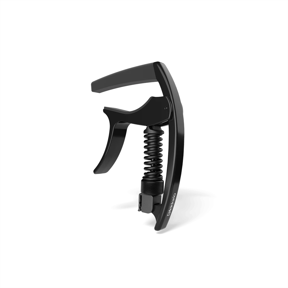 The Tri-Action capo assures buzz-free, in tune performance at any fret. The patented Tri-Action geometry reduces the force required to open and close the capo and applies even tension regardless of neck profile. Combined with the micrometer tension adjustment and direct horizontal pressure, the Tri-Action Capo virtually eliminates pulling the strings side to side and the need to retune during use. Additionally, the lightweight aluminum construction adds negligible weight to the neck of the instrument. The capo features an integrated pick holder. Designed in collaboration with Ned Steinberger – US Pat. 8,779,262