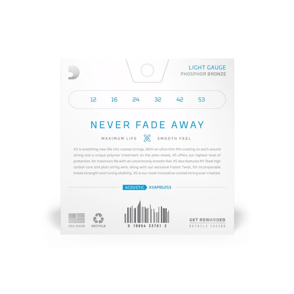 D’Addario XS Acoustic Phosphor Bronze combines our most popular acoustic alloy with our most advanced string coating technology, resulting in clear tone, smooth feel, and superior tuning stability — all with the longest possible string life. Available in Phosphor Bronze for 6 and 12-string acoustic guitar, ranging from extra-light to medium gauges.