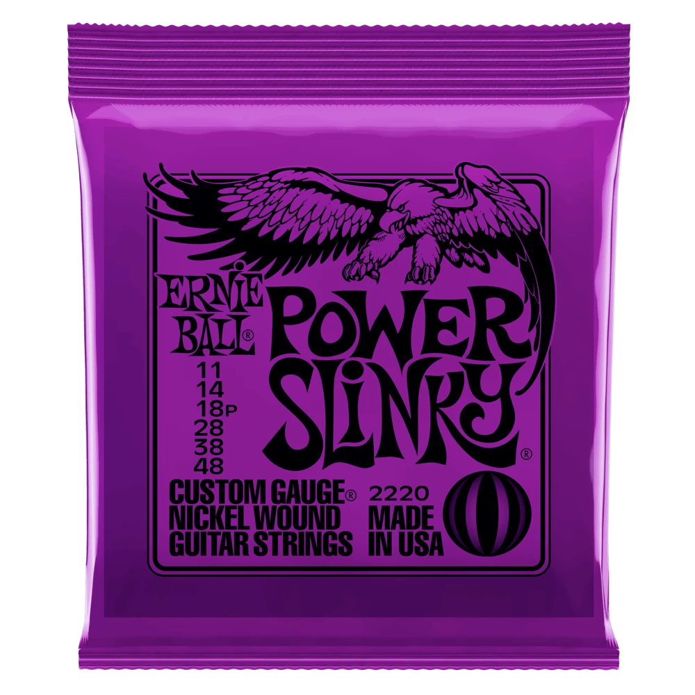 Ernie Ball Power Slinky Electric Strings are a perfect match for those who like chunky rhythms for rock and roll or blues Power Slinkys have long been favored by Slash, Metallica, and Kenny Wayne Shepherd due to the thicker gauge combination providing a slightly more powerful tone These strings are precision manufactured to the highest standards and most exacting specifications to ensure consistency, optimum performance, and long life Power Slinky wound strings are made from nickel plated steel wire wrapped around a hex shaped steel core wire The plain strings are made of specially tempered tin plated high carbon steel producing a well balanced tone for your guitar Gauges .011, .014, .018p, .028, .038, .048