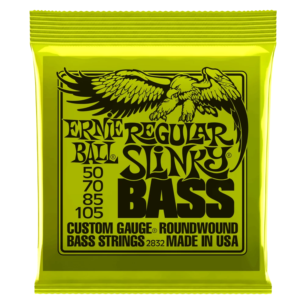 Ernie Ball Regular Slinky Bass sets are wound for a bright, balanced tone. Each bass string is manufactured with the finest and freshest raw materials in the beautiful Coachella Valley of Southern California. The list of endorsers for Ernie Ball Slinky bass strings reads like a who’s who of top selling artists. Gauges .050, .070, .085, .105