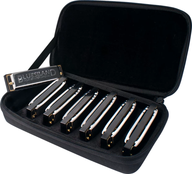 Durable seven slotted neoprene case includes seven Blues Band harmonicas in the keys of G,A,Bb,C,D,E,F. Blow the blues with the HOHNER Blues Band! The Blues Band is easy to play and ideal for beginners or anyone looking for a durable harp on a tight budget.