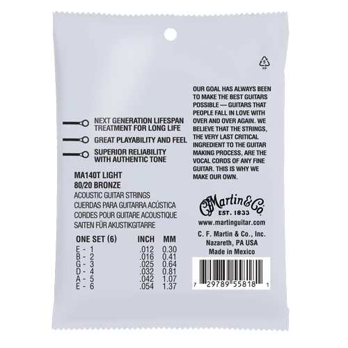 Martin’s next generation Lifespan 2.0 strings are engineered using a new, patented technology only available from Martin. This technology was developed to protect the core wire and the wrap wire to prevent corrosion without compromising tone. Authentic Acoustic Lifespan 2.0 strings look better, sound better, and feel better, providing a smooth playing experience that reduces finger drag. Martin Authentic Acoustic Lifespan® 2.0 strings offer next generation treatment for long life, great playability and feel, and superior reliability with authentic tone. Martin MA140T treated strings.