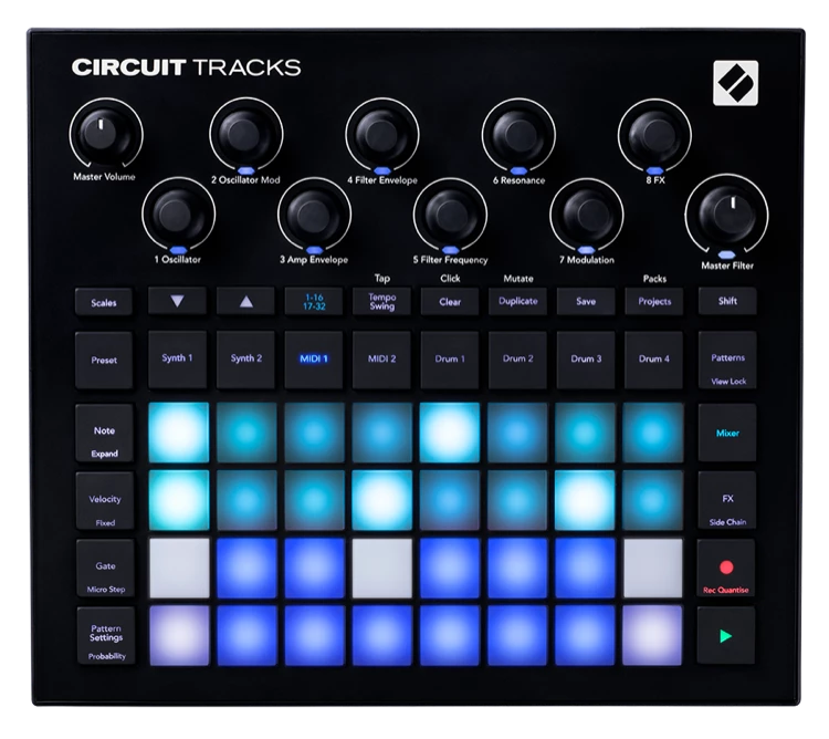 Engineered for immediacy and pure creative expression, Circuit Tracks is a performerās dream. Velocity-sensitive pads and tactile control with customisable patches bring you closer to your music for maximum enjoyment. Define your sound by going off-grid with microtiming, and keep evolving with probability and pattern mutate.
