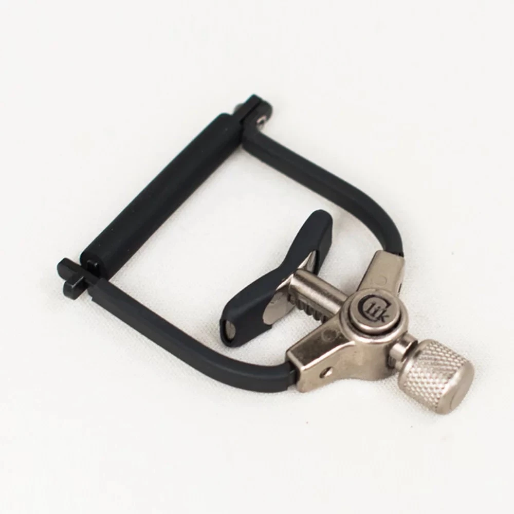 Banjo/Mandolin Capo with 14” radius, direct center-tension design, quick-release mechanism and finish-safe tubing.