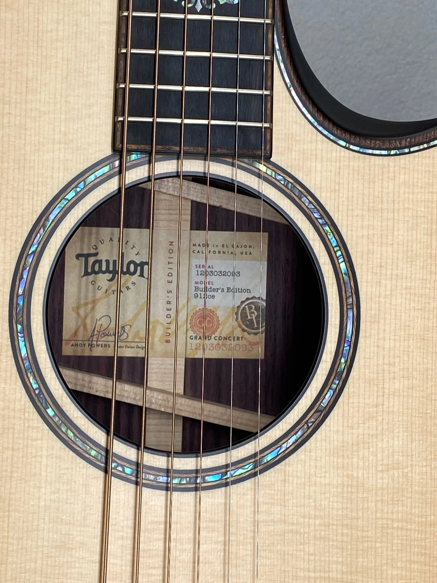 Taylor premieres their Builder’s Edition line in the 900 Series with the elegant 912ce Grand Concert model. Allowing this guitar to play comfortably, sound dynamic and detailed, and look beautifully are features like solid East Indian rosewood back and sides, a solid Lutz spruce top, V-Class bracing, 1 3/4” neck width, ebony fingerboard, a beveled armrest and cutaway, contoured body and fretboard edges, Taylor’s ES2 electronics, Belle Fleur design abalone and mother-of-pearl inlays, ebony bridge pins, headstock overlay, peghead binding, and truss rod cover, and a deluxe hardshell case.